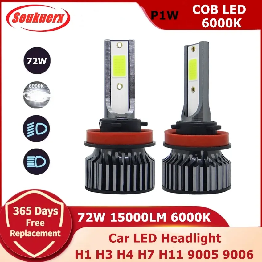 P1W H11 H7 9005 9006 Car LED Headlight Bulbs H4 Hi-Lo Beam 72W/Pair 15000LM 6000K HB3 HB4 Auto Headlamp Fog Lights